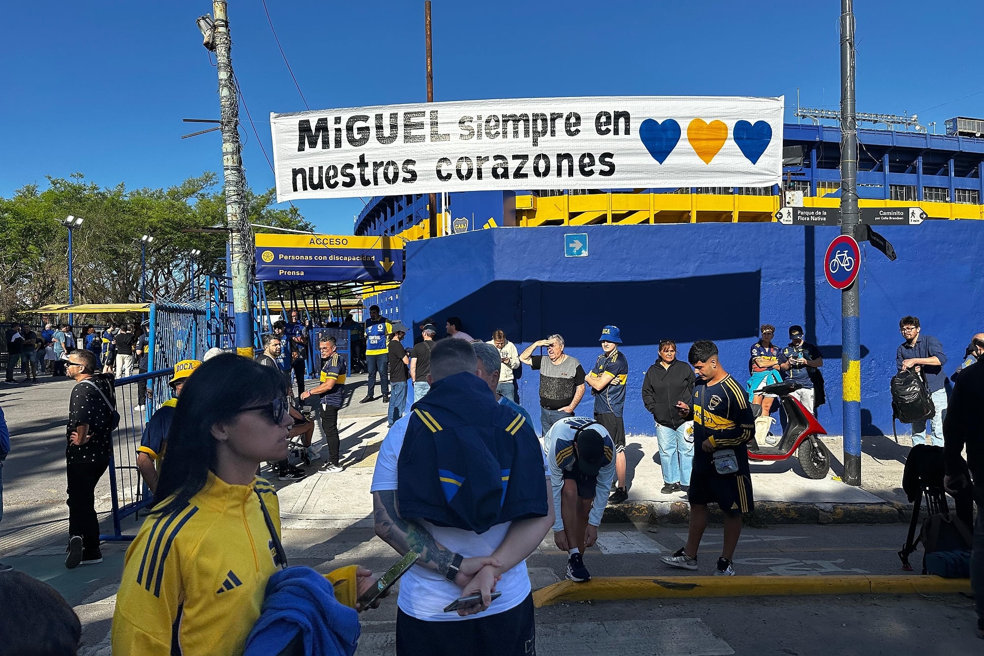 “Miguel, siempre en nuestros corazones”. Así, solo Miguel, advierten los pasacalles que están alrededor de la Bombonera y por diferentes rincones del barrio de la Boca. A los carteles de las afueras de la Bombonera se le sumaron banderas, canciones en agradecimiento y el parche en la camiseta con la imagen de Miguel besando a la Libertadores de 2007.