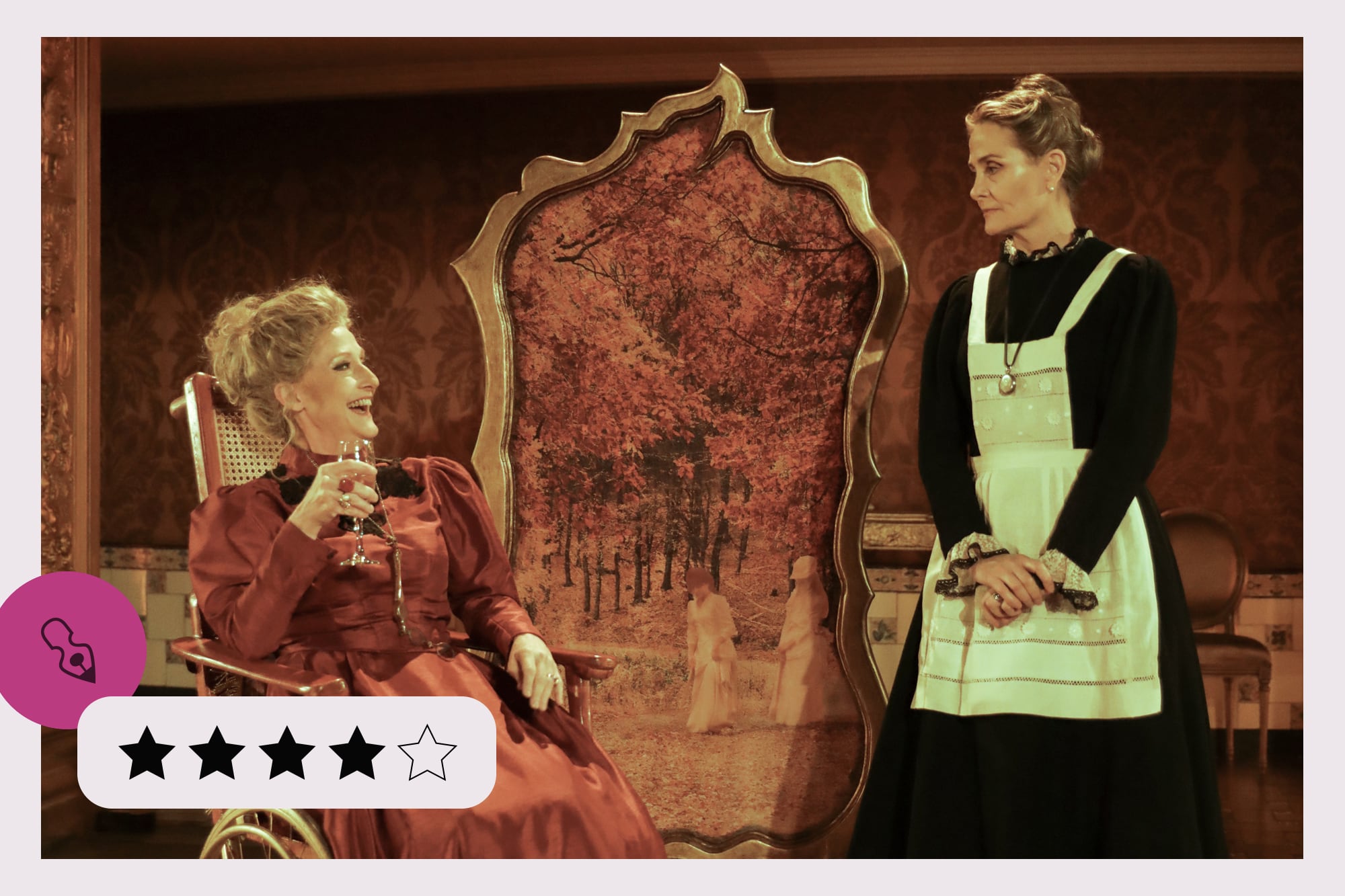 El salón dorado. Versión del cuento de Manuel Mujica Lainez de Marcelo Zapata y Oscar Barney Finn. Intérpretes: Malena Figó, Mercedes Fraile, Lucila Gandolfo. Vestuario: Isabel Zuccheri. Planta escénica: Oscar Barney Finn. Iluminación: Claudio Del Bianco. Música: Rafael Delgado. Dirección: Oscar Barney Finn. Sala: Teatro Nacional Cervantes, Libertad 815. Funciones: jueves a domingos a las 18. Nuestra opinión: muy buena.