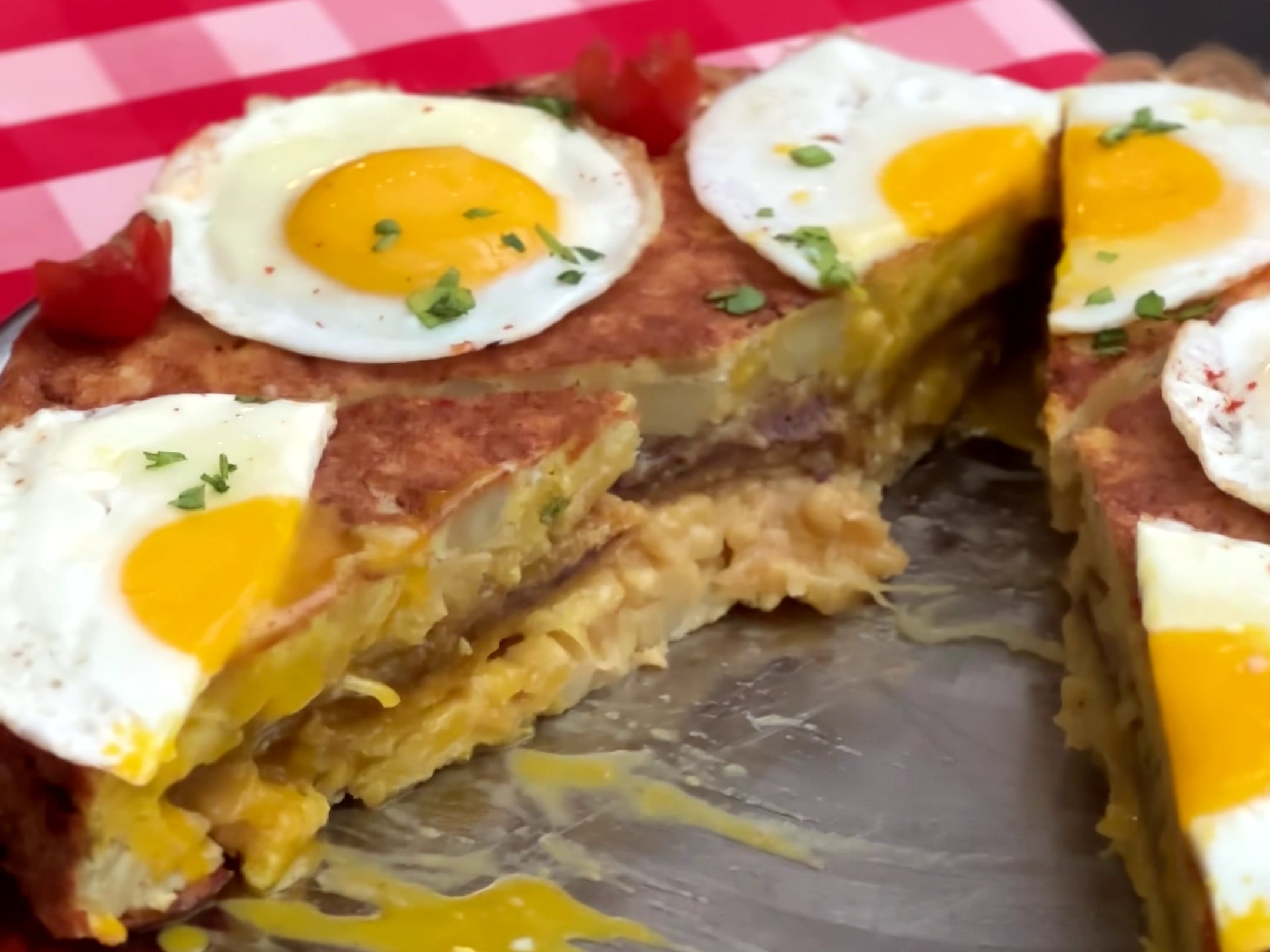 En un bodegón famoso. Cómo se hace la tortilla más argentina: rellena con milanesa y coronada con cuatro huevos​