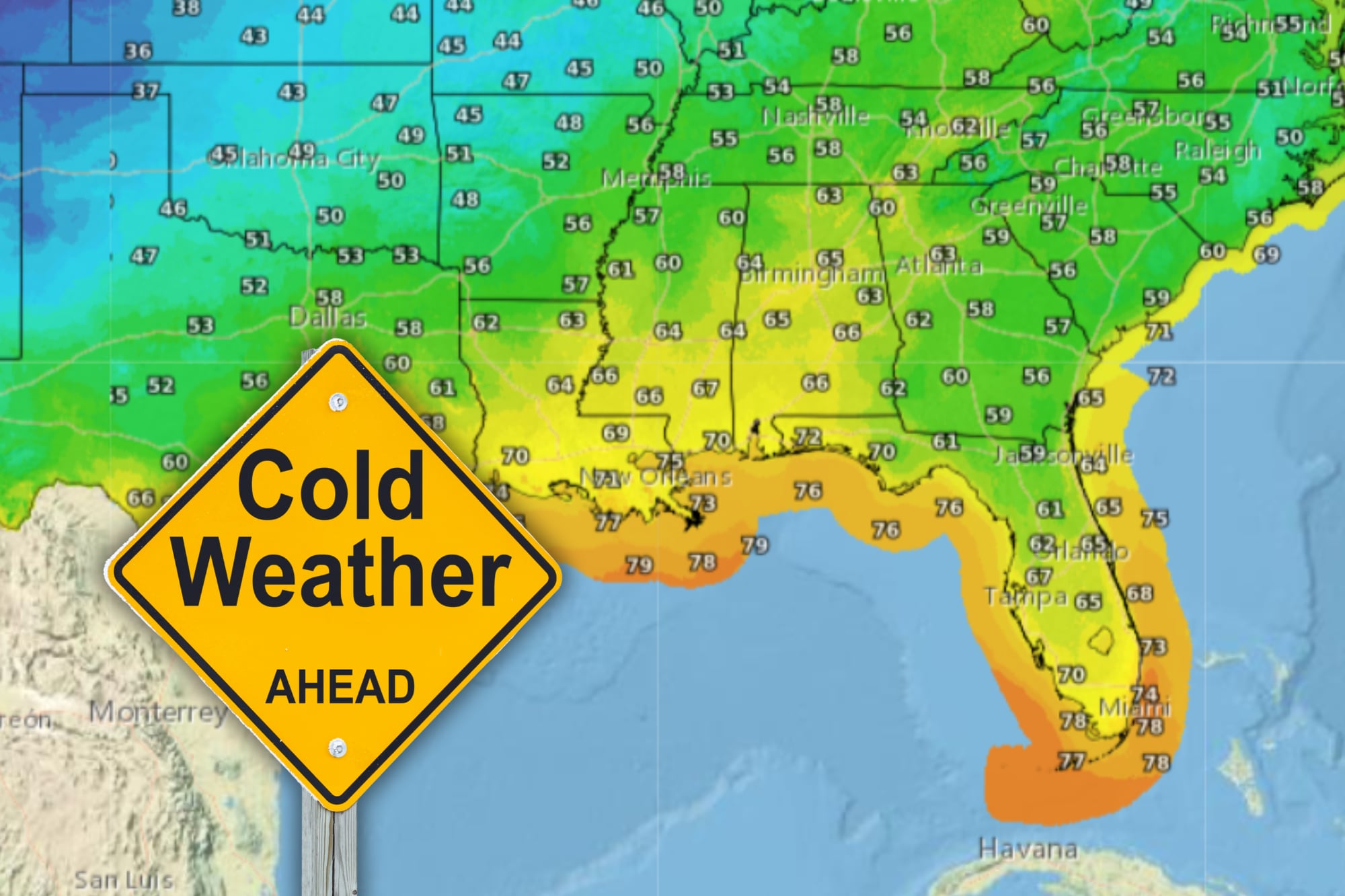 ​ Un frente frío llegará a Florida este fin de semana y bajará las temperaturas, con mínimas cercanas a 58 °F (14 °C) en el Panhandle, según el pronóstico oficial.  Florida