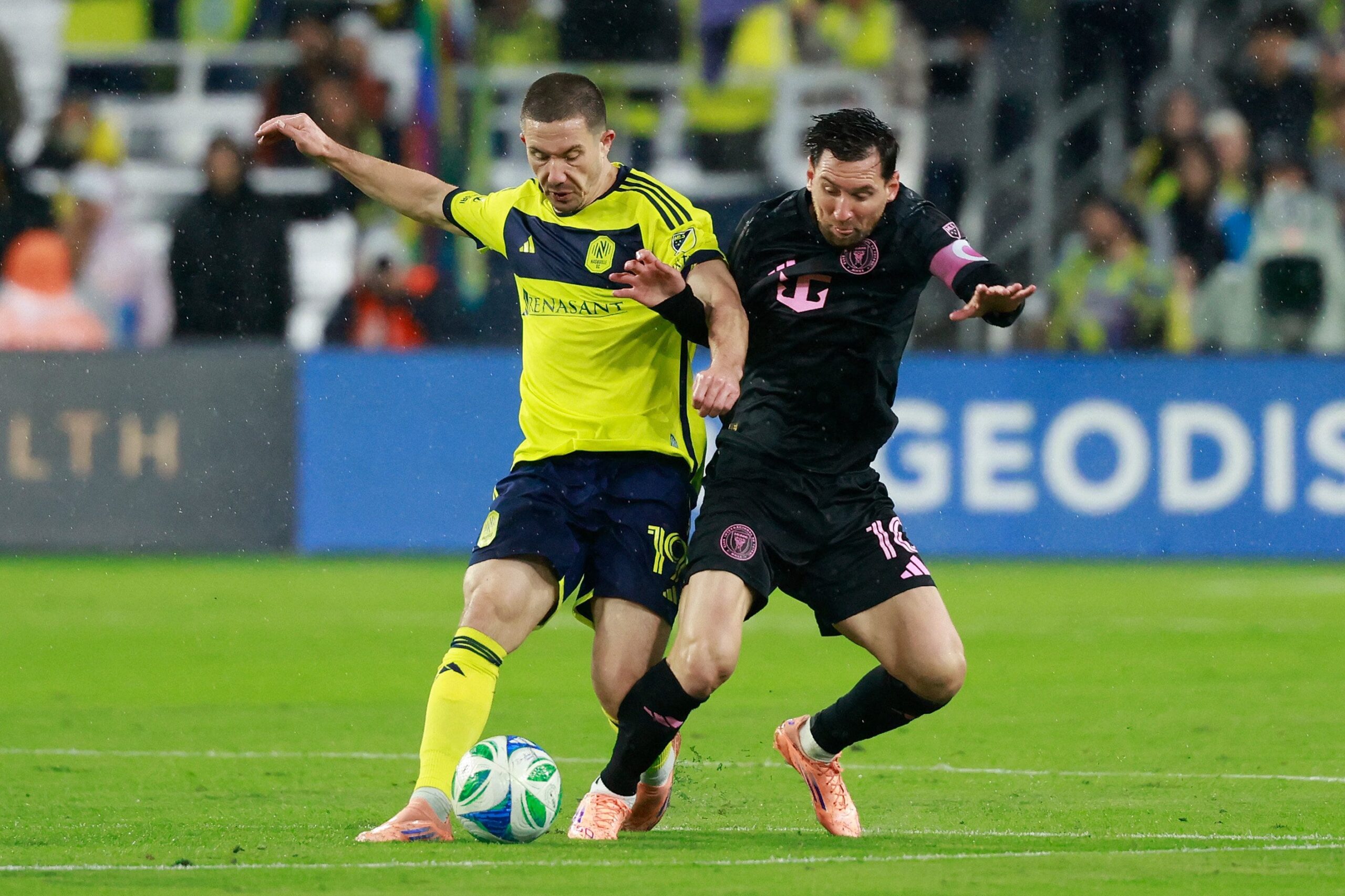 Messi estuvo incómodo en el primer cuarto de hora del partido. Es más, luego de desperdiciar una chance inmejorable tras sacarse de encima a un rival, a la Pulga le hicieron sentir el rigor físico. El árbitro no dio la falta. Y el rosarino se levantó y le mostró al réferi su tobillo izquierdo. “Mirá, mirá”, pareció decirle. Dos minutos después, Nashville casi llega al 2-0. Aprovechando la cancha húmeda, Muyl probó entre las piernas de Maximiliano Falcón, la pelota se desvió y rozó el travesaño.