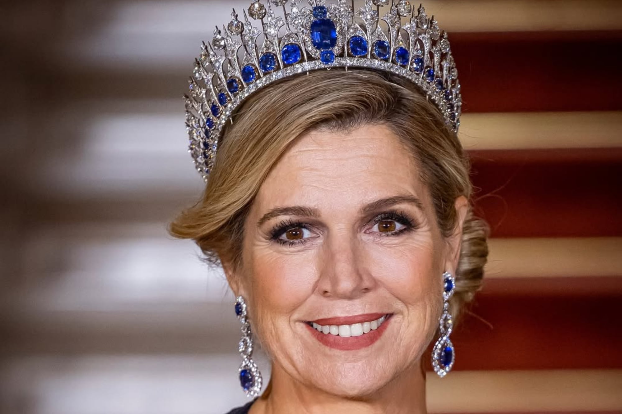 La monarca lució la tiara de diamantes y zafiros que usó para convertirse en reina aquel 30 de abril de 2013. Se trata de una pieza ancestral que el rey Guillermo III -tatarabuelo del actual monarca- le hizo en 1881 a su segunda esposa, la reina Emma. La corona fue modificada para que Máxima pudiera lucirla. También llevó unos pendientes colgantes de zafiros y un prendedor a la altura del pecho. Sin duda alguna, fue una de las mejores vestidas de la gala.