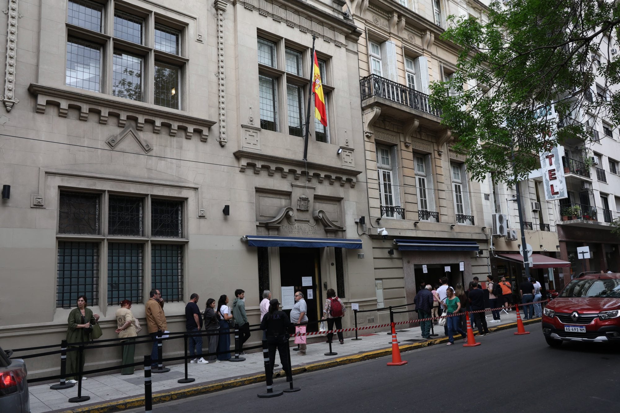 En el Consulado de España en Buenos Aires el panorama era totalmente diferente. Esta sede cuenta con un sistema de citas previas y turnos dividido por horarios, por eso había filas cortas con personas que habían obtenido el turno hacía tiempo.