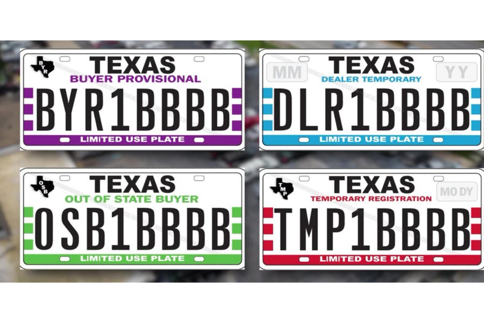 Morado: indica que se trata de placas provisionales para el comprador, cuando el concesionario le entrega el vehículo mientras la matrícula que le pertenece no se encuentra disponible.Azul: es para las placas provisionales para los empleados del concesionario, que las utilizan con fines comerciales, pruebas de conducir o para circular vehículos de préstamo.Verde: estas matrículas están destinadas a los compradores foráneos, es decir, visitantes de otros estados que adquieren un vehículo en Texas y desean conducirlo fuera del territorio estatal. Esas placas son válidas únicamente por 60 días.Rojo: son placas de matrículas temporales, que sirven para transferir la propiedad de un vehículo. Ofrecidas en los centros de servicio regionales del DMV, sirven como registro temporal y son el reemplazo de los antiguos permisos de 30 días y de un solo viaje.
