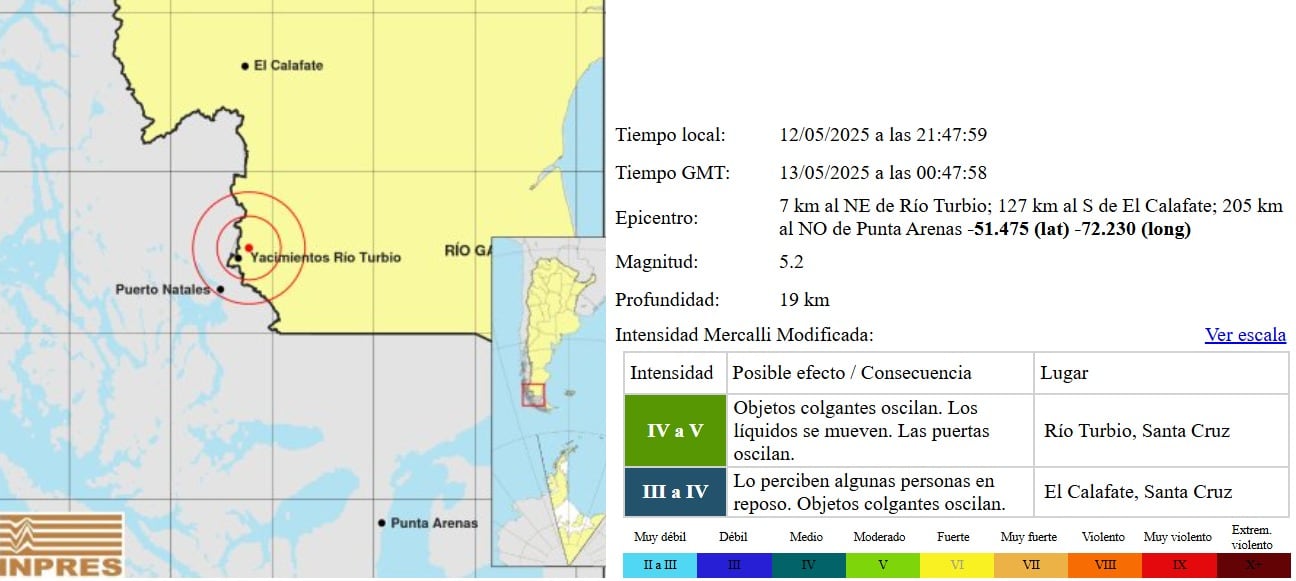 EL CALAFATE.- Un sismo de 5.2 de magnitud sacudió las localidades de Río Turbio y 28 de Noviembre a las 21.47 y se sintió en la localidad chilena de Puerto Natales ubicada a 30 kilómetros del otro lado de la cordillera. Según el reporte del Instituto Nacional de Prevención Sísmica (INPRES) el epicentro se ubicó a 7 km al nordeste de Río Turbio y a 19 km de profundidad.