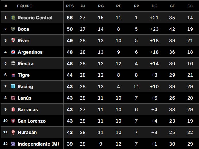 Los seis que les siguen en esa clasificación estarían accediendo a la Sudamericana 2026: Argentinos Juniors y Deportivo Riestra (48); Tigre (44), Racing, Lanús y Barracas Central (43). San Lorenzo y Huracán también tiene 43 unidades, pero están afuera por diferencia de goles.